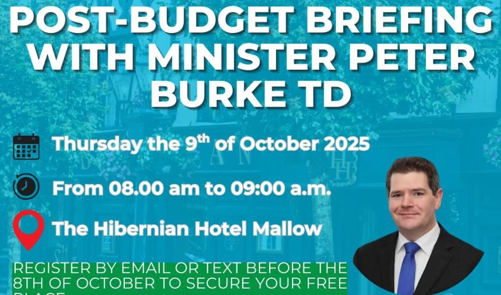 The Fine Gael Mallow District Committee will host a special Post-Budget 2026 Briefing with Minister for Enterprise, Tourism and Employment, Peter Burke TD, in the Hibernian Hotel Mallow, next month.