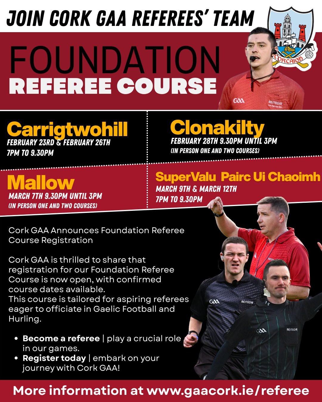 Cork GAA has launched its Foundation Referee Course, which will be hosted at Mallow GAA, offering new referees the chance to officiate Gaelic Football and Hurling across the county.