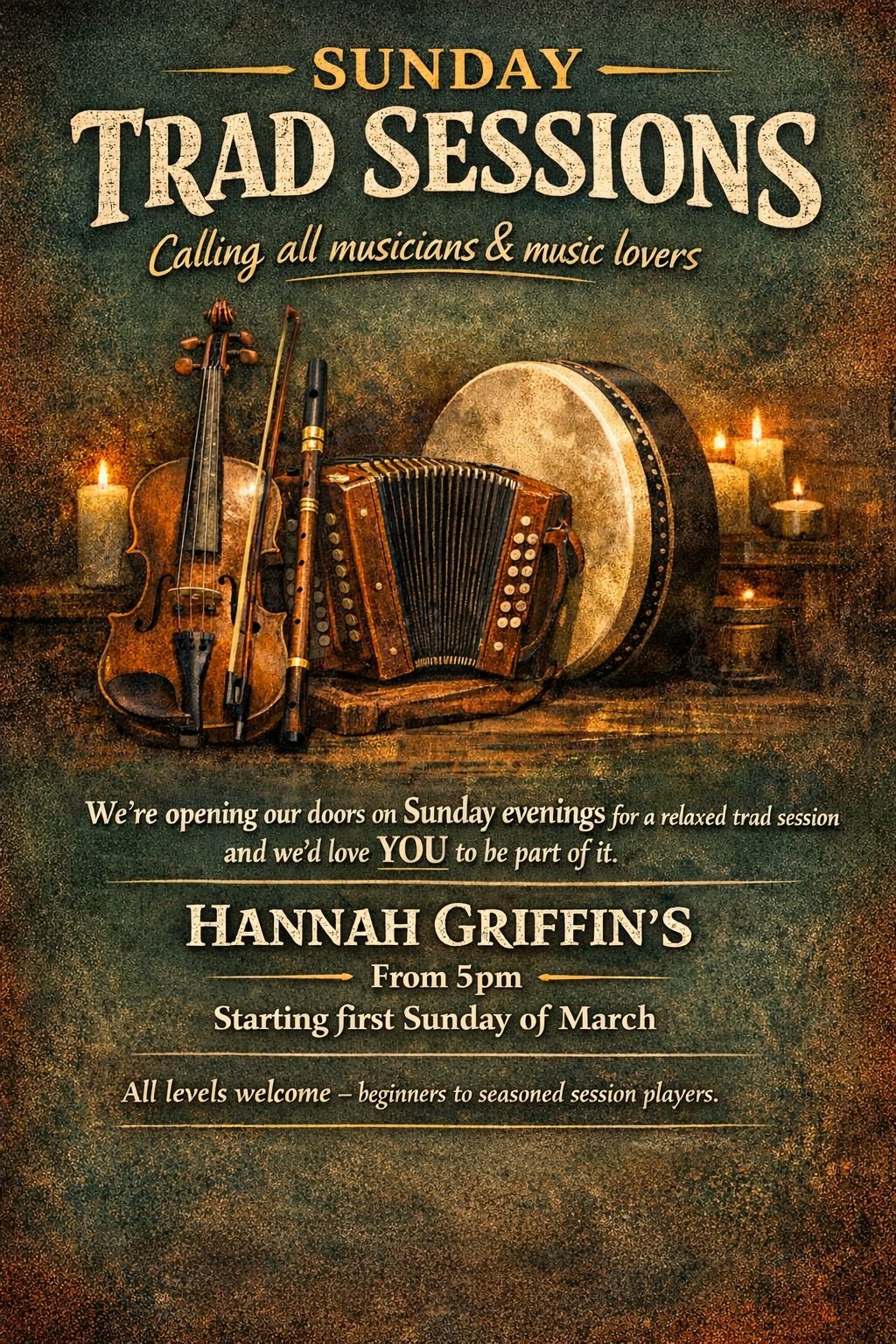 Local hospitality superstar Hannah Griffins is inviting musicians and music lovers of all levels to take part in Sunday evening trad sessions, beginning on the first Sunday of March.
