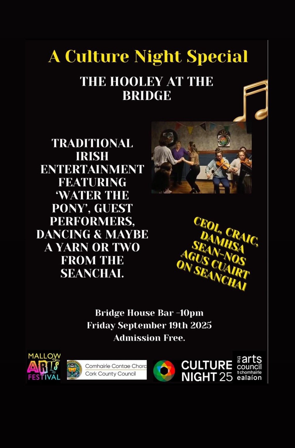 And for those looking to round off the night in style, The Hooley at The Bridge will bring ceol, craic, sean-nós dancing and storytelling to the Bridge House Bar from 10 pm until late, with music from the lively group “Water The Pony.”