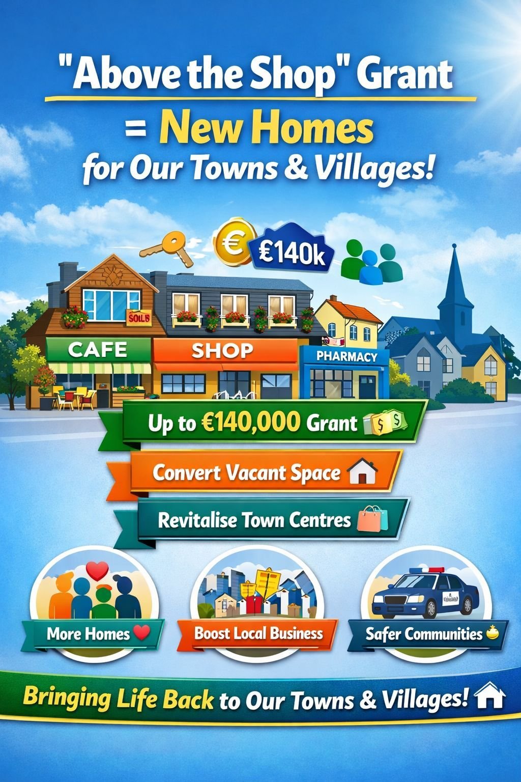 “This is a smart, targeted measure that will help bring life back into the heart of our towns and villages,” he said. “There is huge untapped potential in the space over shops, and this grant will help property owners turn those empty floors into homes for individuals and families.”