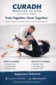 Curadh Brazilian Jiu Jitsu, led by Rory Hennebry, the programme offers classes for both children and adults, introducing students to BJJ, a discipline centred on submission grappling, where practitioners learn to control and subdue opponents using joint locks, chokes, and pins. With no striking involved, it provides a safe and engaging way to build fitness, confidence, and self-defence skills, while also being an addictive and enjoyable full-body workout.