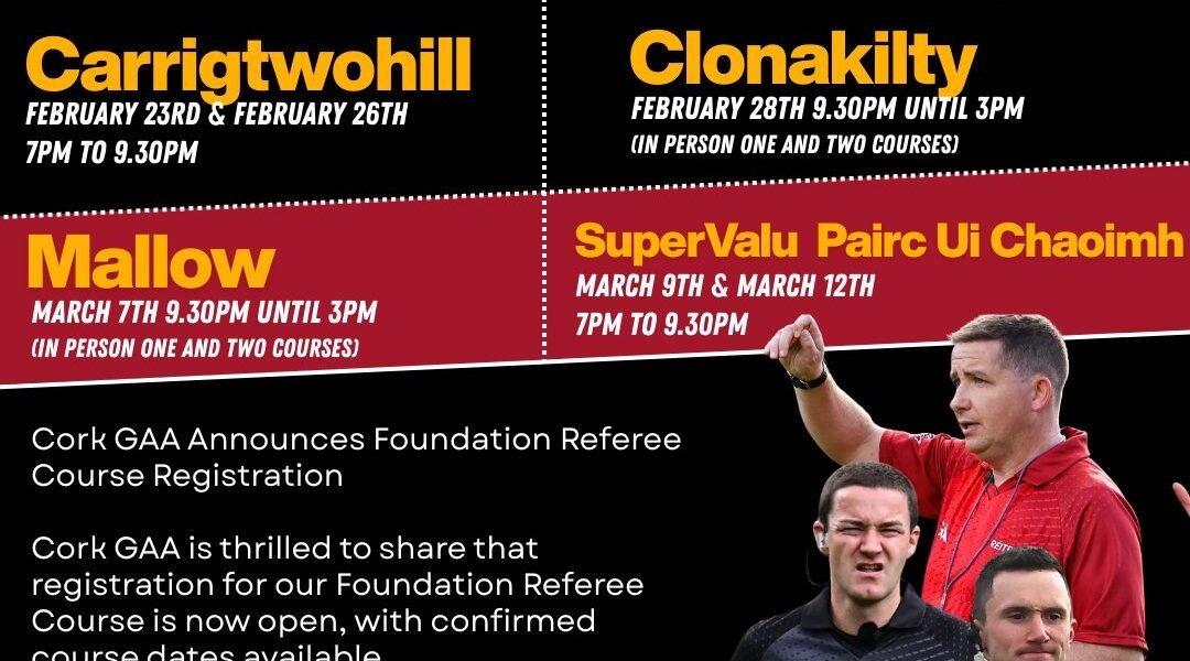 Cork GAA has launched its Foundation Referee Course, which will be hosted at Mallow GAA, offering new referees the chance to officiate Gaelic Football and Hurling across the county. The.