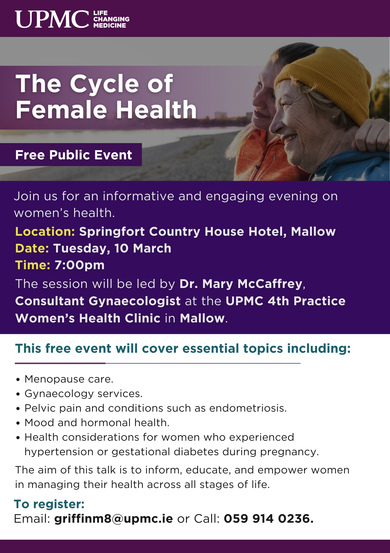Mallow will welcome a free public health event on Tuesday, 10th March at 7:00pm at the Springfort Country House Hotel, hosted by UPMC 4th Practice.