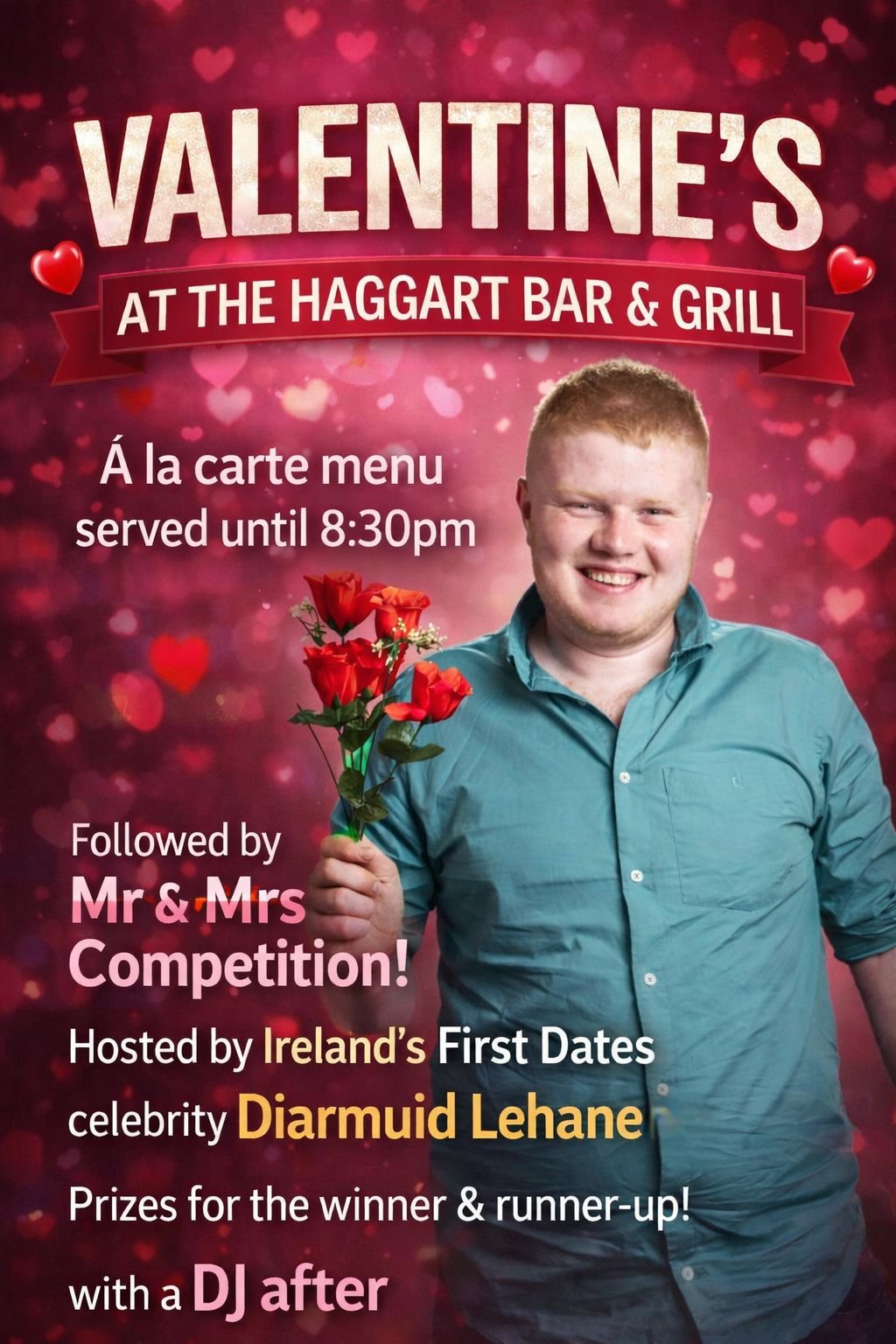This Saturday night, The Haggart Bar & Grill hosts a Valentine’s-themed “Mr & Mrs” quiz, hosted by Diarmuid Lehane, star of Ireland’s First Dates and former youngest publican in Ireland. Guests can enjoy an à la carte menu served until 8:30pm, compete for prizes, and dance off quiz mishaps with a DJ afterwards.
